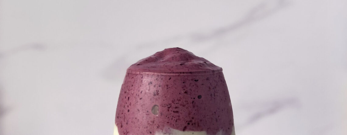 Procesar primero los frutos rojos, y luego incorporar el hielo triturado, la proteína y un chorrito de agua. Procesar hasta obtener una mezcla cremosa. Si queda muy espesa, agregar a gusto agua hasta obtener la consistencia deseada. Verter la mezcla oscura en el mismo vaso y disfruta de este smoothie protéico!